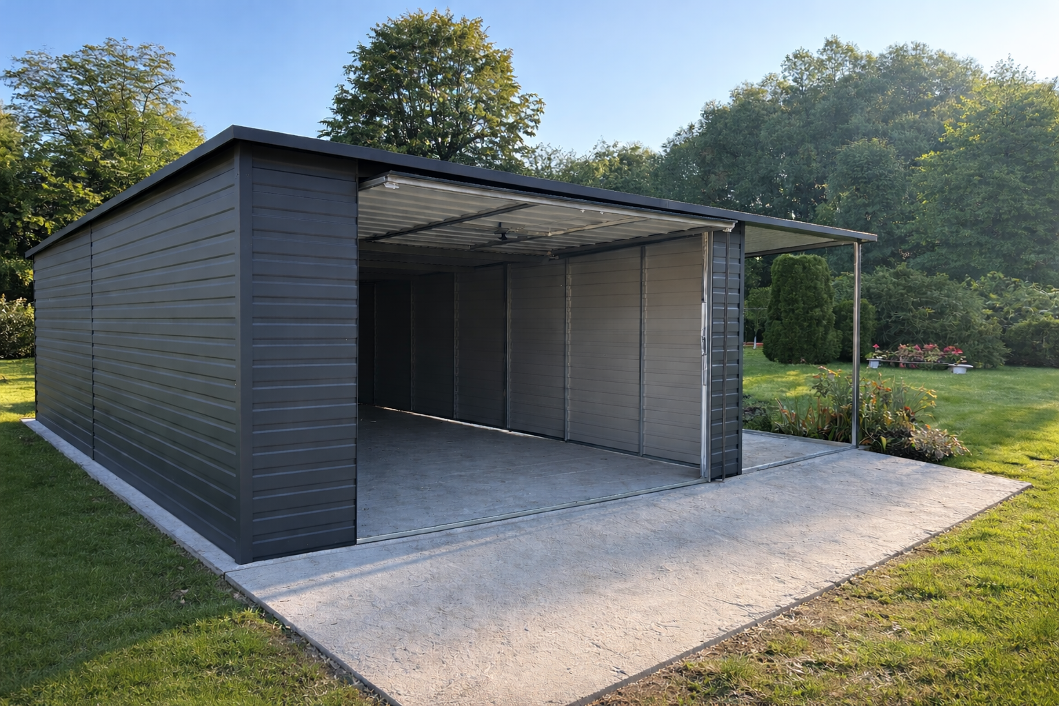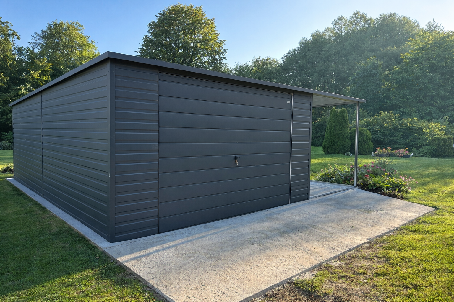 Prezentujemy garaż blaszany o wymiarach 6×5 m, stanowiący przestronne i bezpieczne miejsce dla Twojego samochodu. Konstrukcja oparta jest na wzmocnionych profilach zamkniętych ocynkowanych, co zapewnia wysoką sztywność i odporność na korozję. W standardzie garaż posiada pełne wykończenie blacharskie (narożniki, dach), estetyczne poziome ułożenie blachy oraz bardzo praktyczną wiatę.