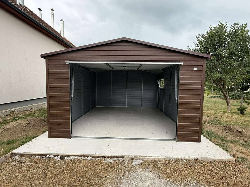 Prezentujemy garaż blaszany o wymiarach 5×6 m, stanowiący przestronne i bezpieczne miejsce dla Twoich samochodów. Konstrukcja oparta jest na wzmocnionych profilach zamkniętych ocynkowanych, co zapewnia wysoką sztywność i odporność na korozję. W standardzie garaż posiada pełne wykończenie blacharskie (narożniki, dach), estetyczne poziome ułożenie blachy.